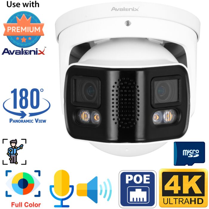 Check out this Full Color 4K Panoramic PoE Camera with Microphone from Avalonix, a leader in surveillance technology! This powerhouse outdoor PoE Camera is part of the Premium Series Avalonix Products. It offers a panoramic 180° 4K view thanks to its dual 4MP image sensors. Yes there are two cameras placed side by side inside one case, and the video produced is a stitched Panoramic view that is output through one PoE connection. Such a dual video sensor camera setup provides not only a wide angle of view, but it retains image clarity at a distance. No longer are you limited by conventional fixed single-lens security cameras because this one can recognize faces up to 50 feet away during the day even at its wide 180-degree angle.